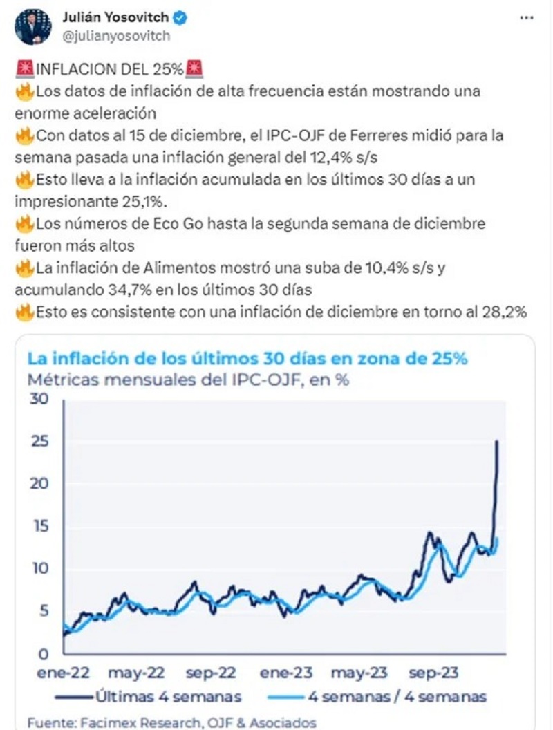 El tweet surge luego de que muchas consultoras privadas reestimaran la inflación de diciembre en torno al 25% o 30%, con el rubro alimentos acelerándose a niveles insostenibles. Según las proyecciones, este sector mostró una suba de 10,4% y acumuló 34,7% en los últimos 30 días.