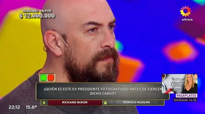El participante santiagueño perdió en el segmento “Fotos del mundo”, cuando le preguntaron: “¿Quién es este expresidente fotografiado antes de ejercer dicho cargo?”. El padre de Agustina se inclinó por Richard Nixton, pero finalmente la respuesta correcta era Ronald Reagan.