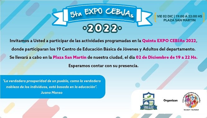 El viernes 02 de diciembre en la plaza San Martín, tendrá lugar la exposición de la que participarán alumnos de los 19 CEBJA que hay en San Rafael, por lo que se espera la participación de una verdadera multitud de personas, teniendo en cuenta que esas instituciones educativas se ubican en distintos puntos de nuestro departamento, representando por lo general a un distrito. Es un evento muy interesante que no se desarrolla producto de la pandemia, desde hace dos años.