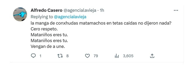 Y continuó: “¿La manga de conxhudas matamachos en tetas caídas no dijeron nada? Cero respeto. Mataniños eres tú. Mataniños eres tú. Vengan de a une”.