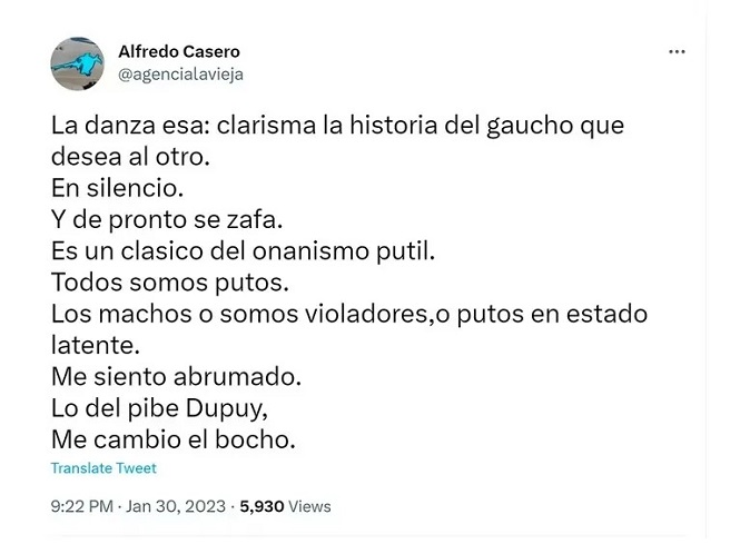 “La danza esa: clarísima la historia del gaucho que desea al otro. En silencio. Y de pronto se zafa. Es un clásico del onanismo putil. Todos somos putos. Los machos o somos violadores, o putos en estado latente. Me siento abrumado. Lo del pibe Dupuy, me cambio el bocho”, escribió el ex Cha Cha Cha en el primero de sus mensajes.