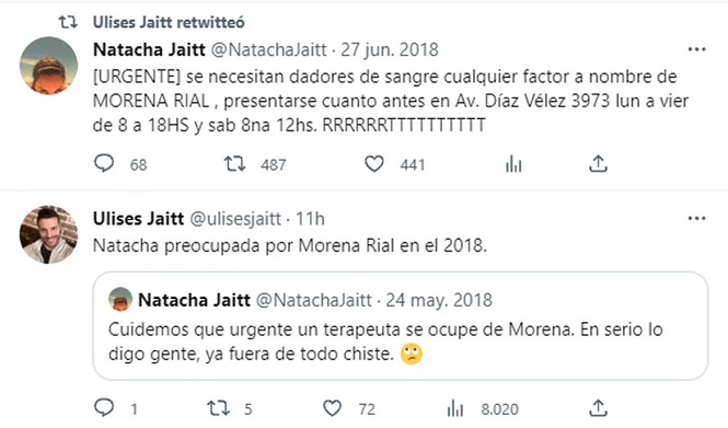 Además, Ulises compartió los tweets que había publicado su hermana pidiendo ayuda para More. “Cuidemos que urgente un terapeuta se ocupe de Morena. En serio lo digo gente, ya fuera de todo chiste”, expresa una publicación, y en la otra pedía donantes de sangre para la hija de Jorge Rial.