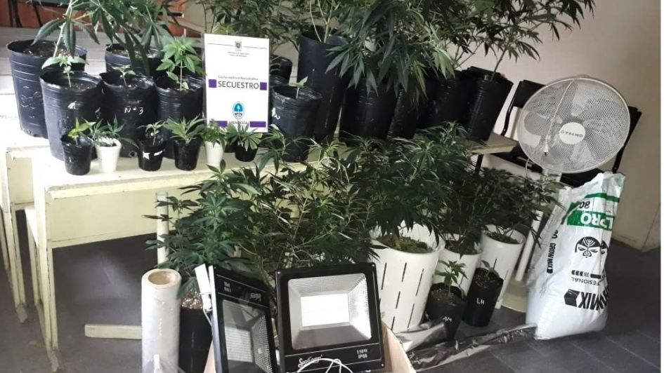 La segunda medida de allanamiento se realizó en una vivienda de calle Emilio Mitre donde se procedió a la detención de un hombre mayor de edad y al secuestro de más de 15 plantas de marihuana, dinero en efectivo, dos teléfonos celulares, un notebook, 53 botellas de aceite de cannabis, y elementos para el cultivo.