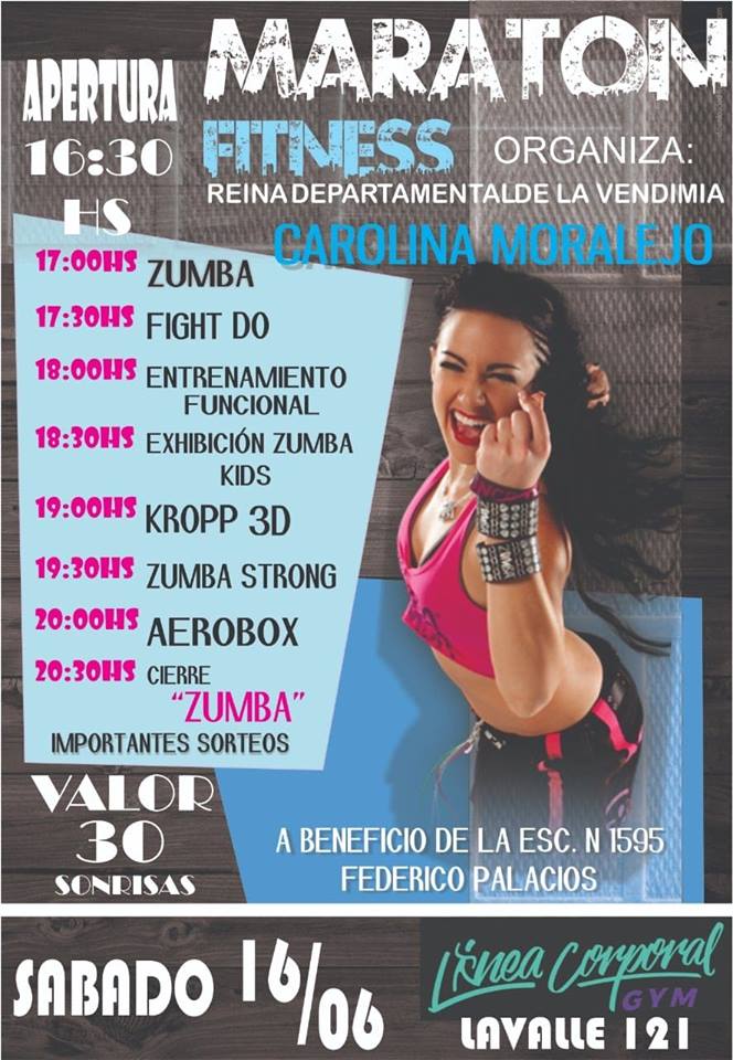 Organizada por nuestra Reina Departamental de la Vendimia Carolina Moralejo, se realizará el próximo sábado 16 de junio, una Maratón Fitness en el Gimnasio “Línea Corporal”, ubicado en calle Lavalle 121, a total beneficio de la escuela Nº 1595 Federico Palacios de El Sosneado.