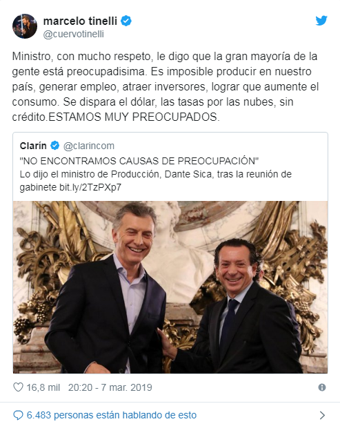 En tanto, Tinelli también habló sobre las críticas al ministro de Producción, Dante Sica, quien había manifestado que la suba del dólar “no es una precupación para el Gobierno”, tras la disparada que sufrió la moneda estadounidense.