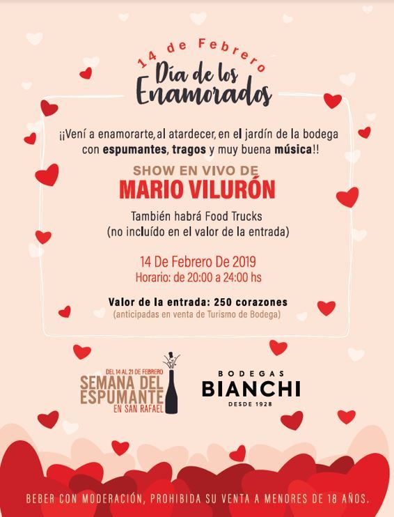 Este año Bodegas Bianchi sorprende a turistas y sanrafaelinos con un festejo del Día de San Valentín que incluye espumantes, tragos y el show de Mario Vilurón, uno de los finalistas de La Voz Argentina.