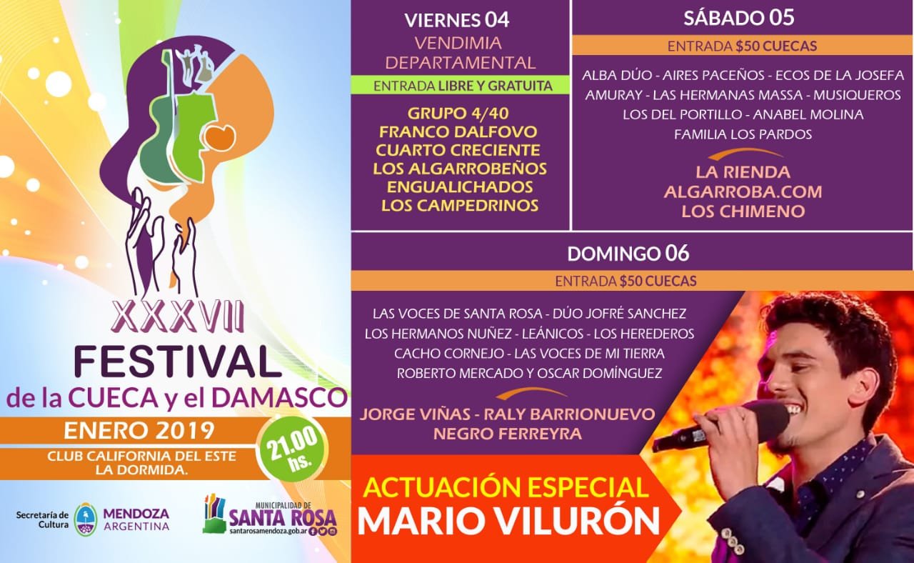 El primer festival del año será en el este provincial, precisamente en Santa Rosa, donde se celebrará la edición número 37º del Festival de la Cueca y el Damasco, evento reconocido por la