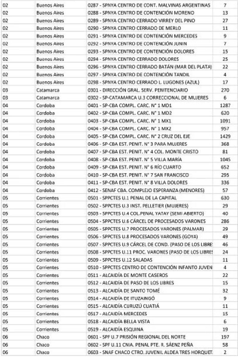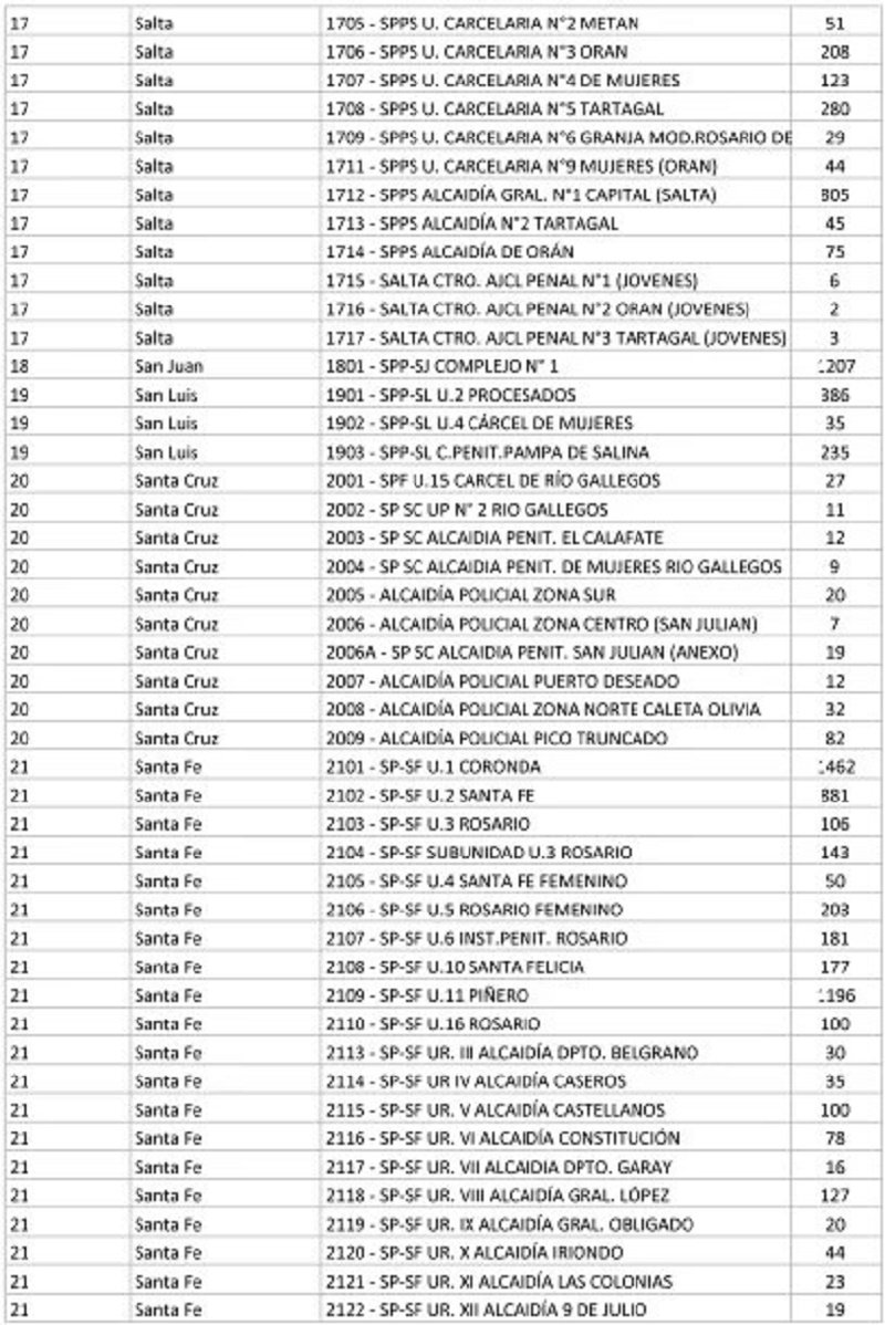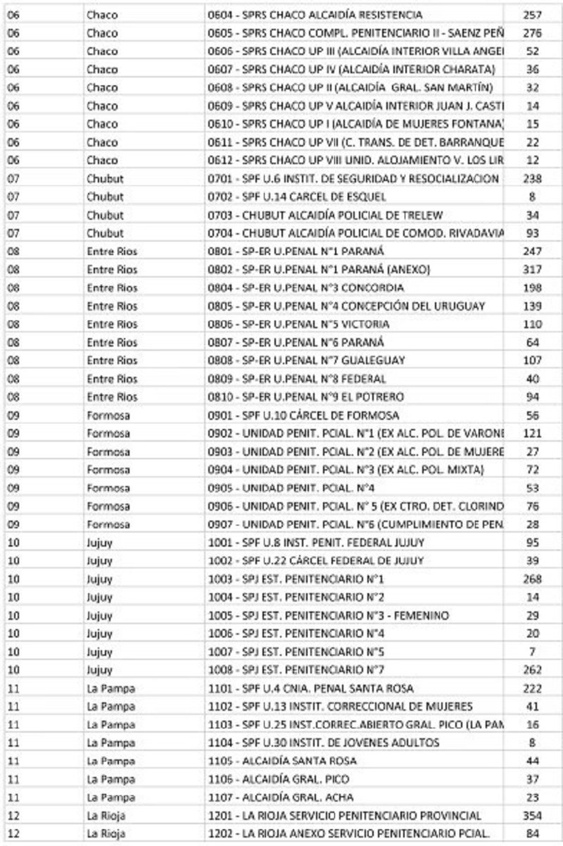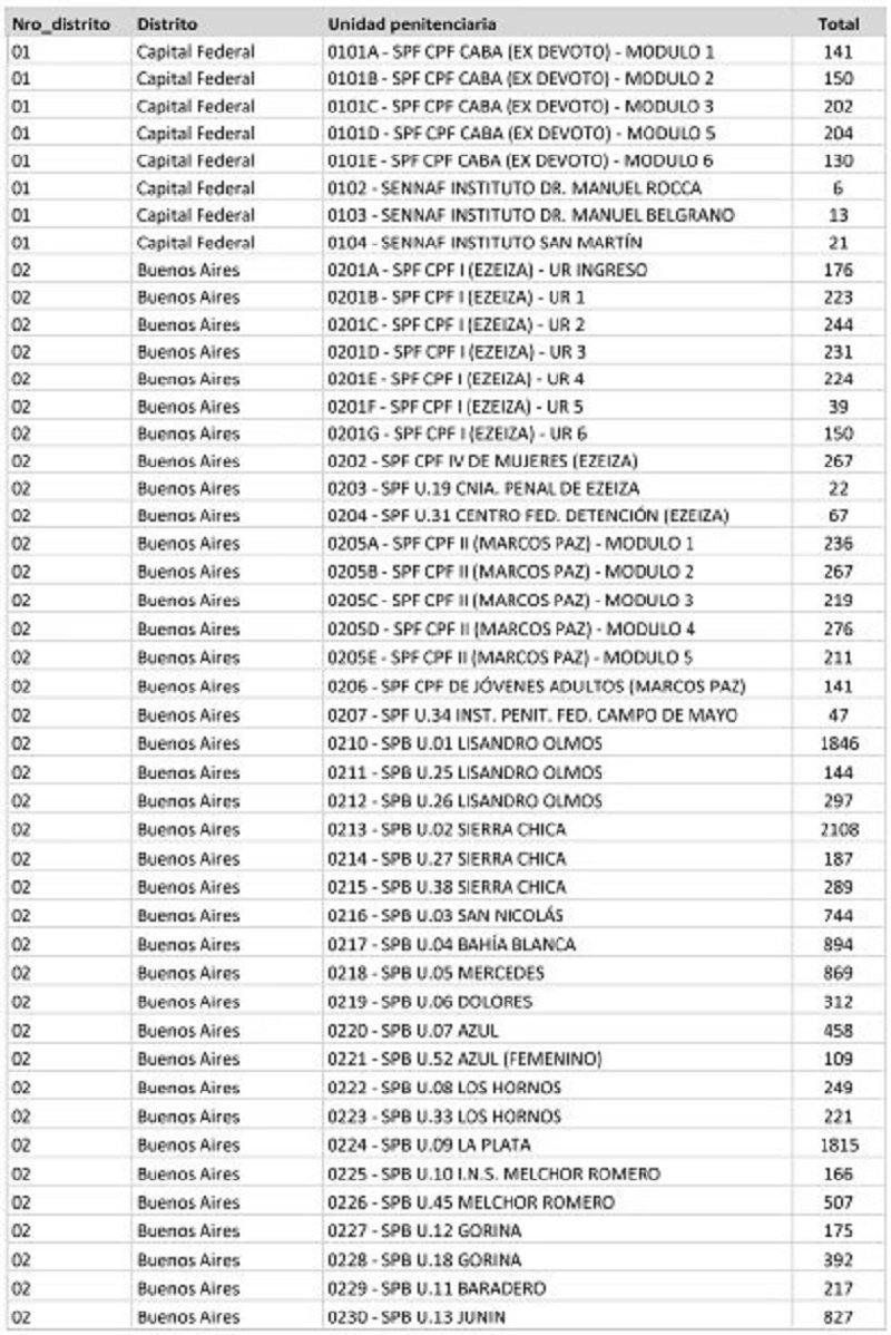 El listado de la cantidad de votantes en cada cárcel del país