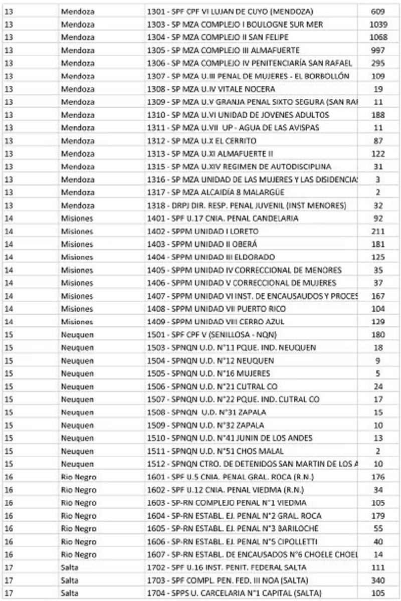 Por su parte, la Ciudad de Buenos Aires tiene 867 electores privados de la libertad; Catamarca, 276; Corrientes, 1.277; Chaco, 973; Chubut, 373; Entre Ríos, 1.316; Formosa, 433; Jujuy, 734; La Pampa, 391; La Rioja, 438; Mendoza, 4.623; Misiones, 1.081; Neuquén, 303; Río Negro, 603; Salta, 2.227; San Juan, 1.207; San Luis, 656; Santa Cruz, 231; Santiago del Estero, 985; Tucumán, 861; y Tierra del Fuego, 130.