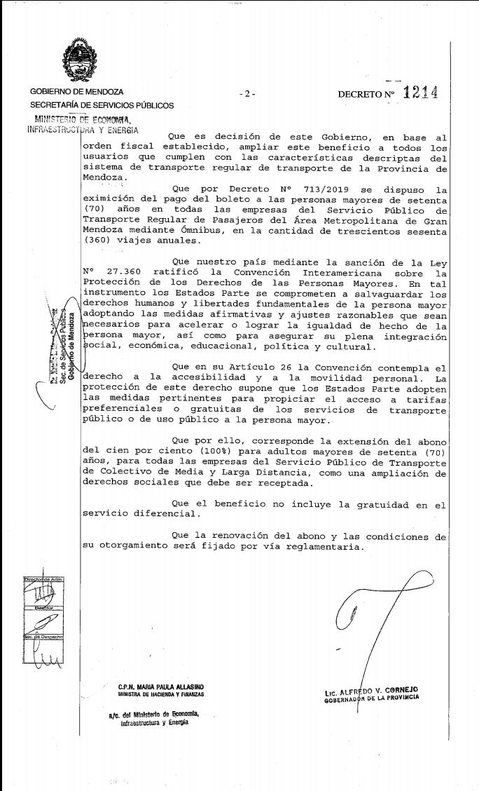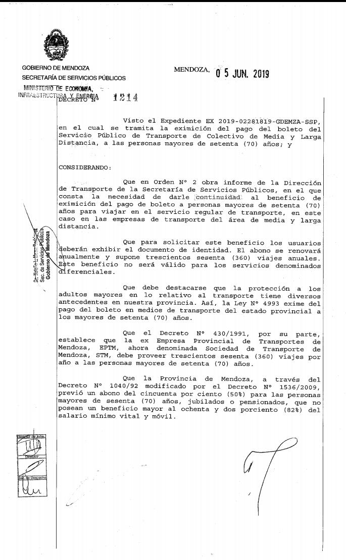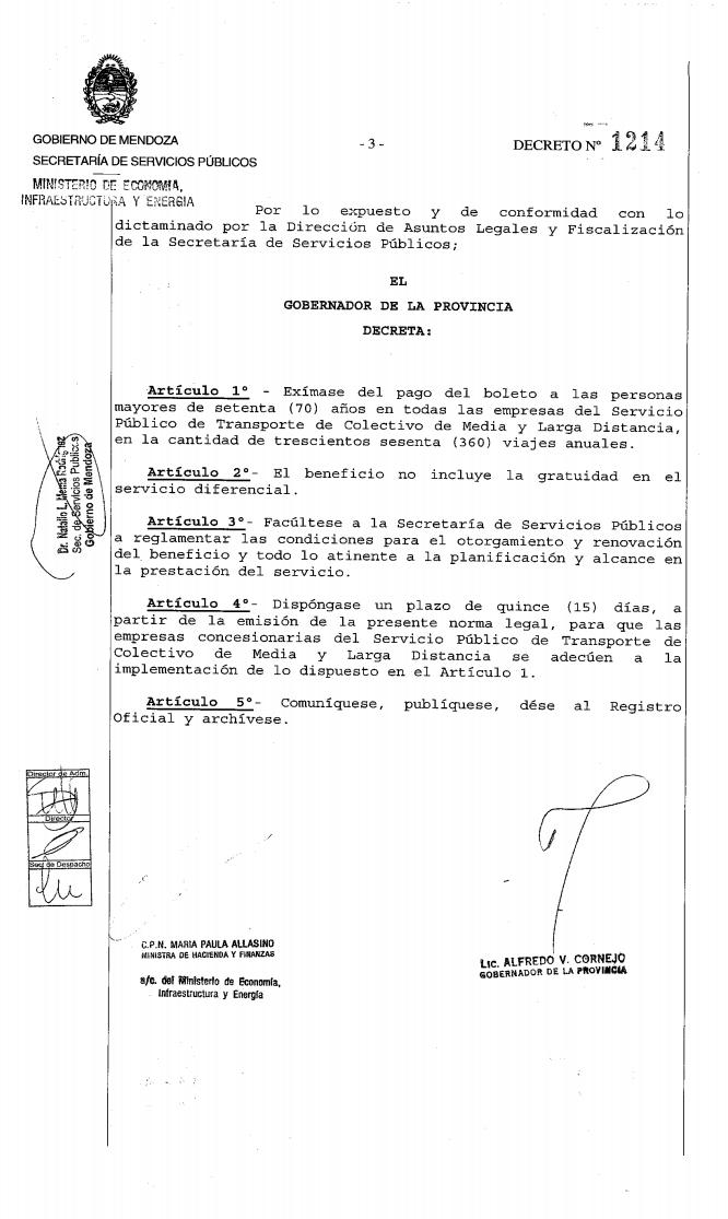 El Gobierno provincial oficializó este miércoles, a través del decreto Nº 1214 que será publicado este jueves en el Boletín Oficial, la eximición del pago de boleto del Servicio de Transporte de Colectivos de Media y Larga distancia a las personas mayores de setenta años. Esta medida se suma a la anterior disposición que incluía el pasaje para el área metropolitana.
