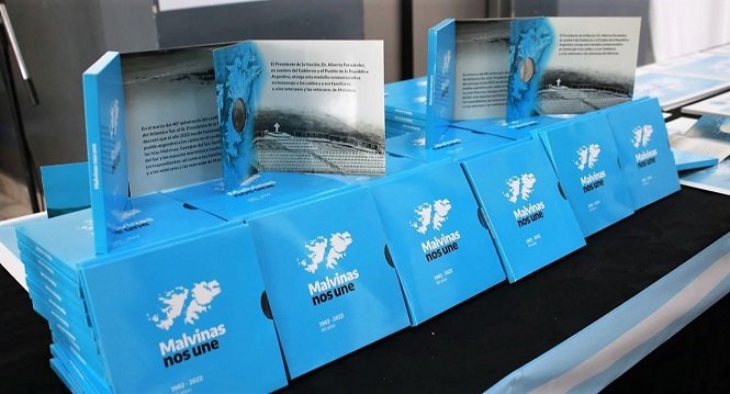Se trata de un diseño que incluye la imagen de las Islas Malvinas y –del otro lado- el Escudo Nacional. La misma está acompañada de una breve reseña histórica sobre la posición del país frente a uno de los últimos enclaves del colonialismo que existen en el país.