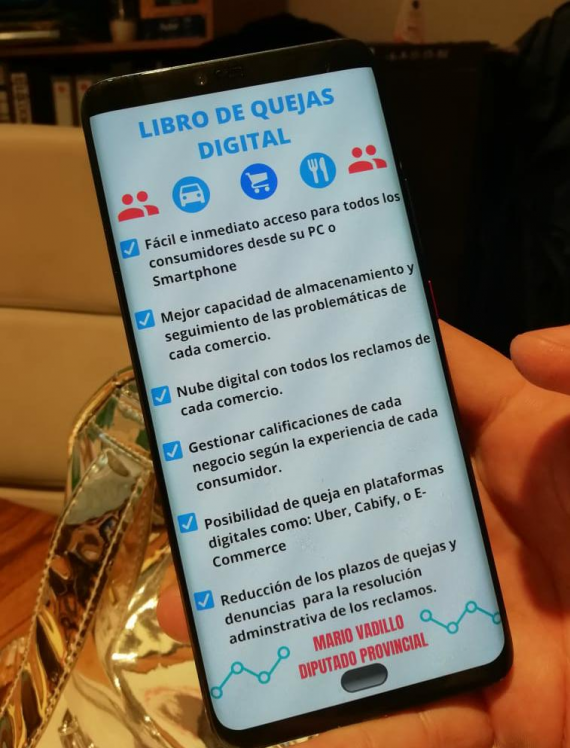 “Actualmente la Ley de Defensa del Consumidor de la Provincia de Mendoza (ley 5547), reglamenta bajo resolución Nº13/2014, en su Artículo 5, la obligatoriedad del Libro de Quejas en todo establecimiento comprendidos en el artículo 1 de dicha resolución”, siendo una herramienta “fundamental para el consumidor, para poder dejar plasmado todo reclamo o disconformidad con el establecimiento comercial que visitó”, además de un “instrumento físico, un cuaderno foliado y sellado aprobado y fiscalizado por Defensa del Consumidor”, explica Vadillo en la fundamentación del proyecto.
