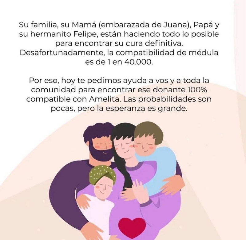 En el caso de Amelia, ni sus padres, ni su hermano, son histocompatibles. Sin embargo, la familia no pierde las esperanzas y días atrás, cuando Julieta dio a luz a la nueva integrante de la familia, se extrajeron células madres del cordón umbilical para realizar los estudios correspondientes que permitan determinar si Juana es compatible o no.