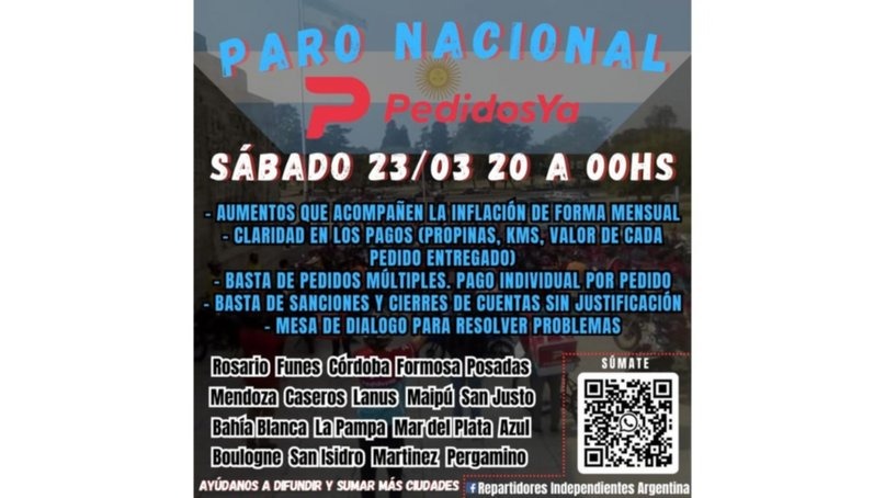 Según una imagen difundida en redes sociales, en la que se insta a la participación de los repartidores de varias ciudades, estos demandan “aumentos que se ajusten a la inflación de manera mensual y transparencia en los pagos (propinas, kilómetros, valor de cada entrega)”.