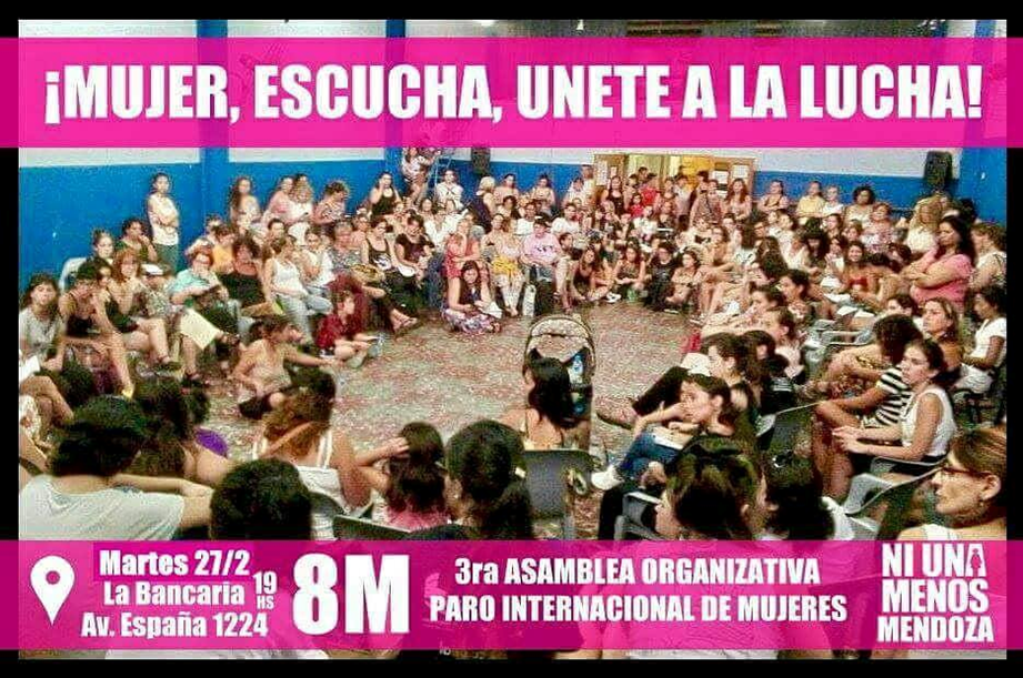 En nuestra provincia la Asamblea de Mendoza junto a Ni una Menos definieron hacer un llamamiento a paro activo y movilización por las calles céntricas el 8 de Marzo.