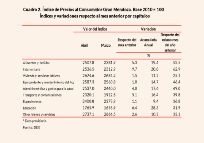 La inflación durante abril para Mendoza llegó a 4,8% en relación al mes anterior, según informó este martes la Dirección de Estadísticas e Investigaciones Económicas de Mendoza.