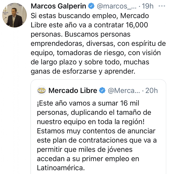 Fue el mismo Marcos Galperín, quien a través de sus redes sociales anunció que Mercado Libre va a buscar alrededor de 16 mil personas para incorporar a la empresa en toda la región.