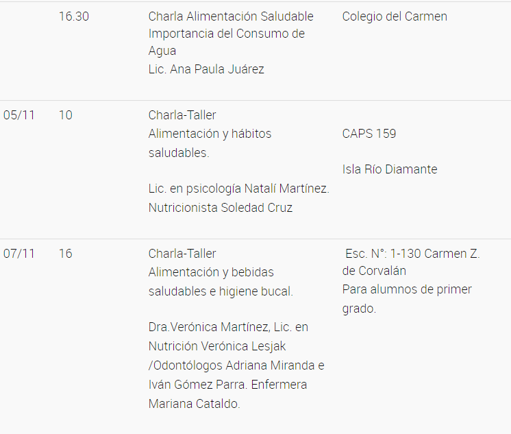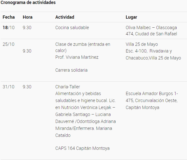 Alejandra Iriarte, coordinadora del Área Sanitaria San Rafael, informó que el calendario de actividades comenzó el 18 de octubre con un Taller de Cocina Saludable, junto al Instituto Gastronómico Oliva Malbec, dictado por Natalia Sánchez, perteneciente al Programa Provincial de Diabetes del Ministerio de Salud de Mendoza. Continuará con actividades en escuelas y centros de salud provinciales.