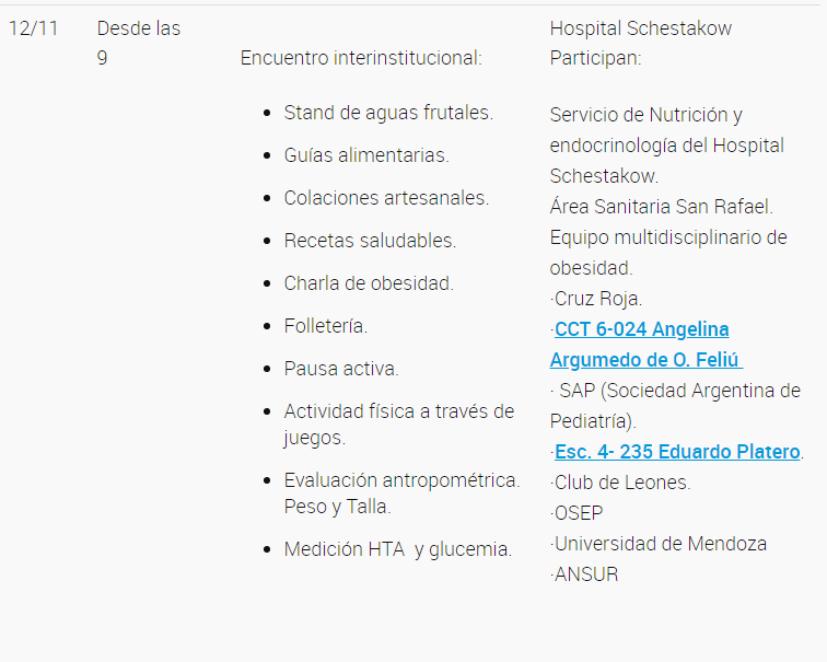 Luis Vergani, director del hospital, anticipó que el 12 de noviembre se llevará a cabo el cierre con una Jornada Interinstitucional en dependencias del Hospital Schestakow. Participarán el Área Sanitaria San Rafael, los servicios de Nutrición y Endocrinología, Cruz Roja Filial San Rafael, la Sociedad Argentina de Pediatría, OSEP, CCT 6-024 Angelina Argumedo de O. Feliú, Esc. 4-235 Eduardo Platero, Universidad de Mendoza, ANSUR y Club de Leones.