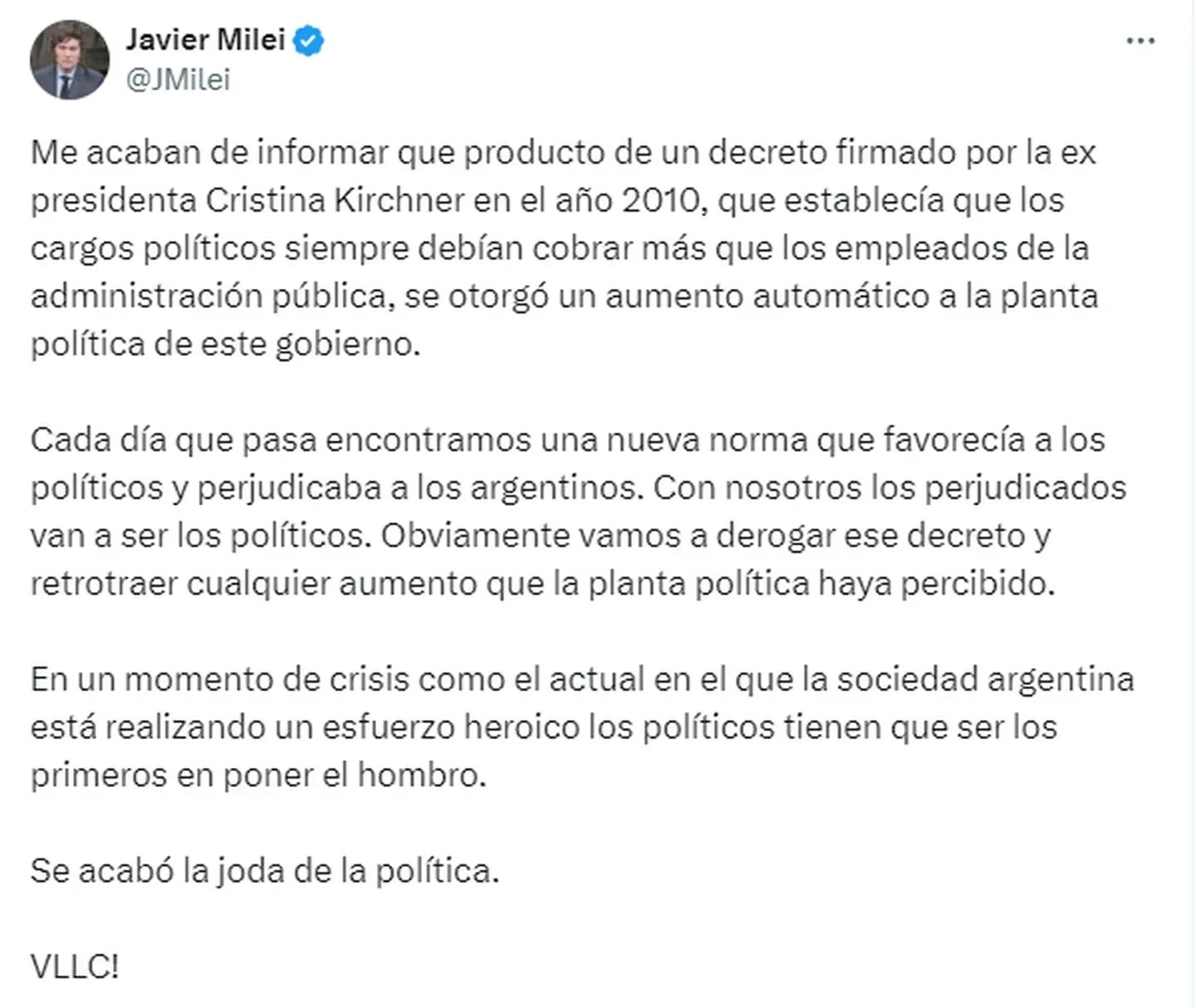 “Me acaban de informar que producto de un decreto firmado por la expresidenta Cristina Kirchner en el año 2010, se otorgó un aumento automático a la planta política de este gobierno”, escribió en X el Presidente.