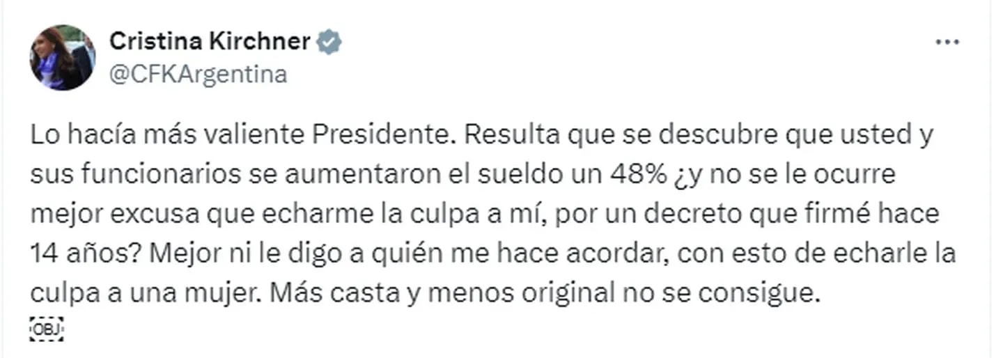 “Lo hacía más valiente Presidente. Resulta que se descubre que usted y sus funcionarios se aumentaron el sueldo un 48% ¿y no se le ocurre mejor excusa que echarme la culpa a mí, por un decreto que firmé hace 14 años? Mejor ni le digo a quién me hace acordar, con esto de echarle la culpa a una mujer. Más casta y menos original no se consigue”, escribió en su cuenta de X.
