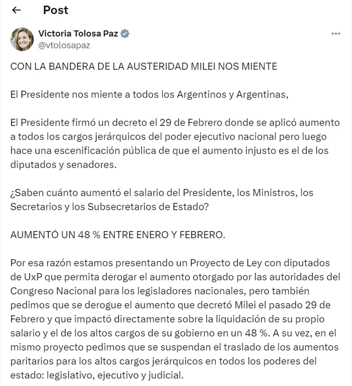 La legisladora de Unión por la Patria, Victoria Tolosa Paz, expresó: “El Presidente firmó un decreto el 29 de febrero donde se aplicó aumento a todos los cargos jerárquicos del poder ejecutivo nacional, pero luego hace una escenificación pública de que el aumento injusto es el de los diputados y senadores. ¿Saben cuánto aumentó el salario del Presidente, los Ministros, los Secretarios y los Subsecretarios de Estado?”, escribió en su cuenta de X.