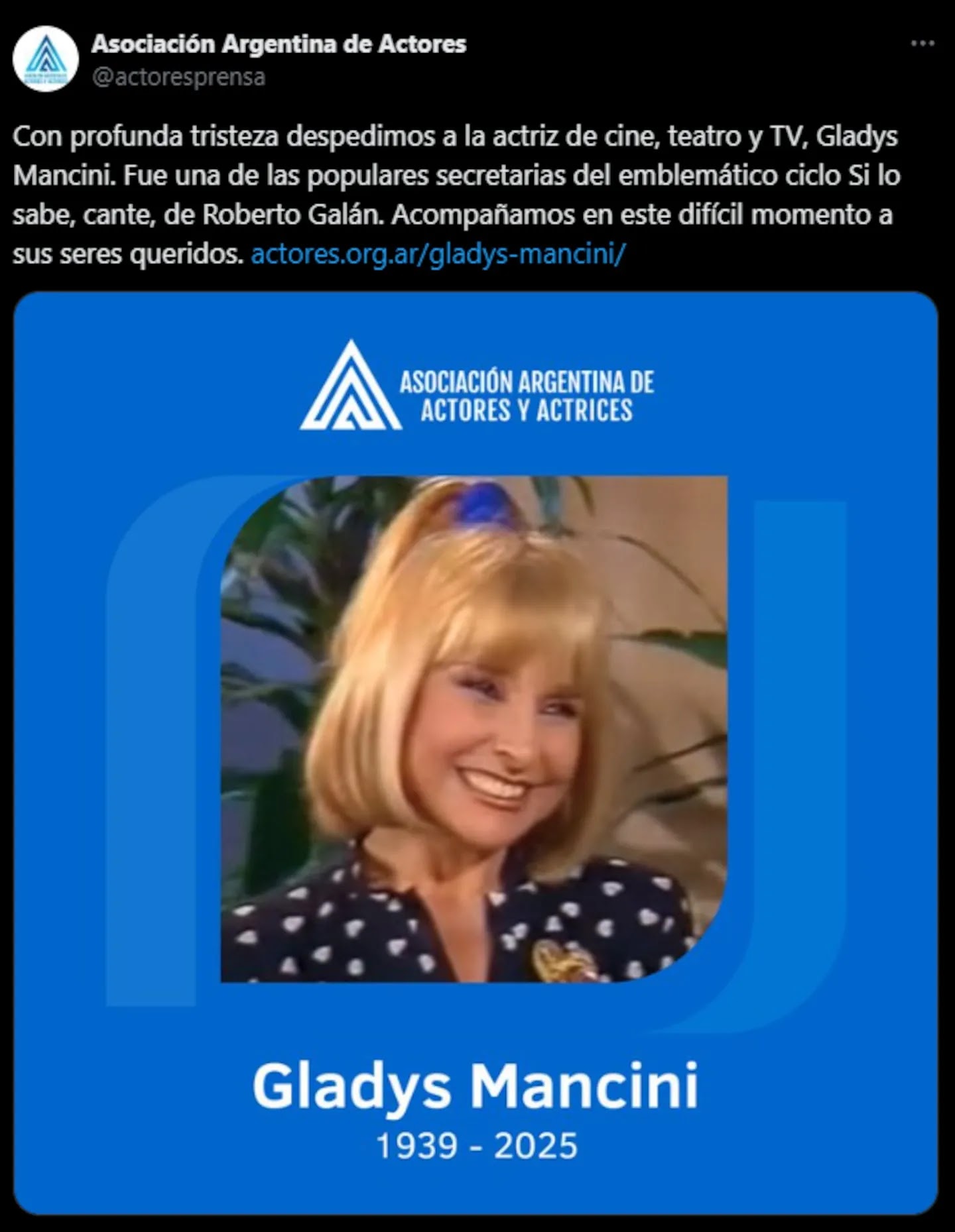 Gladys Mancini murió a los 85 años, según informó la Asociación Argentina de Actores. Tras conocerse la noticia, el mundo del espectáculo la despidió con profunda tristeza y recordó la huella imborrable que dejó en el cine, el teatro y la televisión.