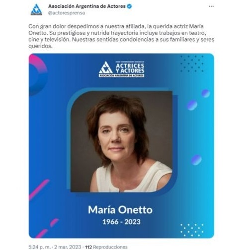 Desde la Asociación Argentina de Actores, se expresó el gran dolor por la pérdida de la querida afiliada. En su comunicado, destacaron la prestigiosa y nutrida trayectoria de Onetto, así como su importante aporte a la cultura y a las artes escénicas.