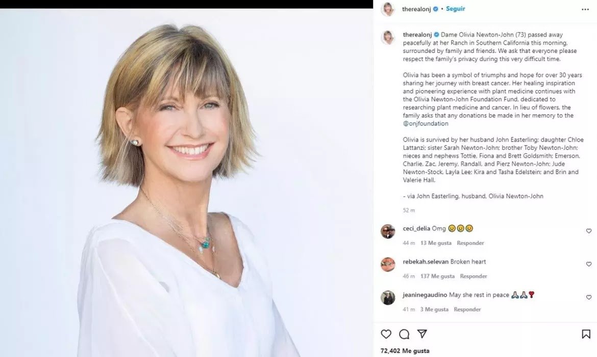 “Olivia ha sido un símbolo para el triunfo y la esperanza durante más de 30 años, en los que ha compartido su experiencia con el cáncer de mama”, indicó el esposo, que pidió que “en lugar de flores” los interesados envíen donaciones a la Fundación Olivia Newton-John, dedicada a la investigación de la medicina vegetal y el cáncer.