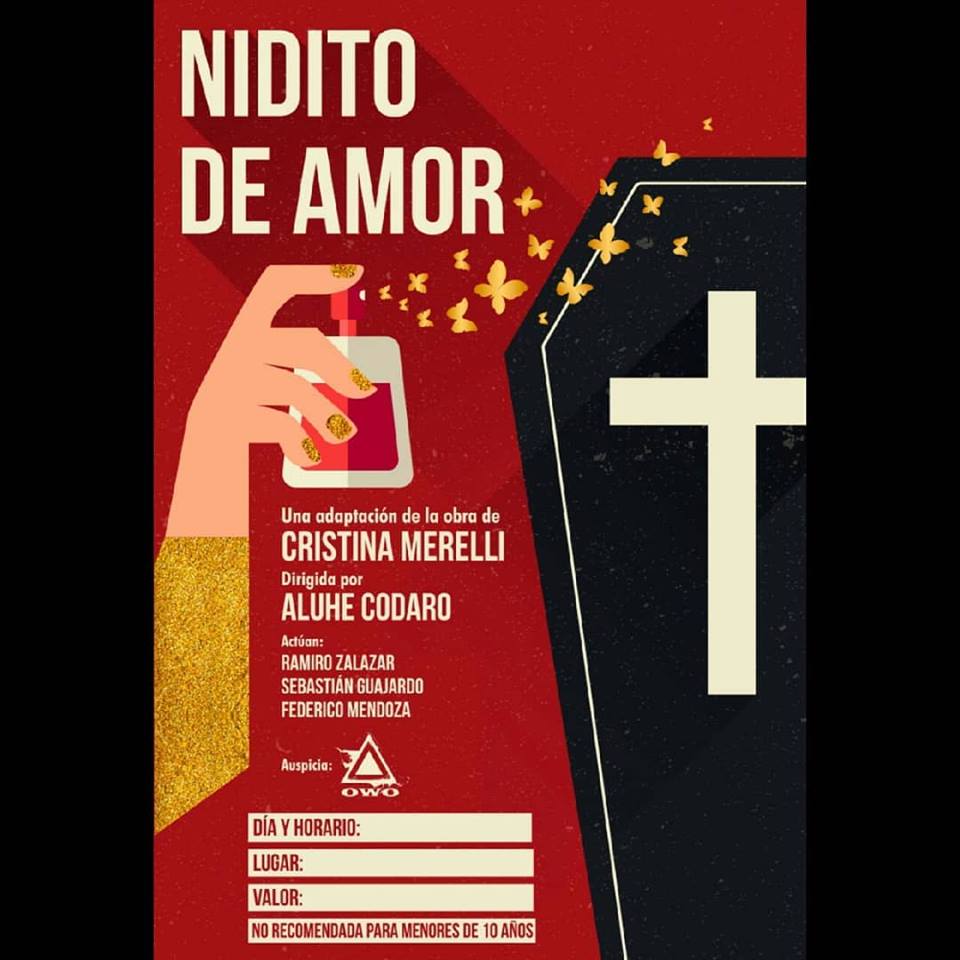 El sábado 3 de noviembre, desde las a las 22, en la Casa en el Aire (Comandante Salas 66), vuelve a las tablas “Nidito de amor”, este trabajo que Aluhe adaptó para rendir Dirección Teatral en el Instituto Profesorado de Arte el año pasado. En este caso, actúan Ramiro Salazar, Sebastián Guajardo y Federico Mendoza.