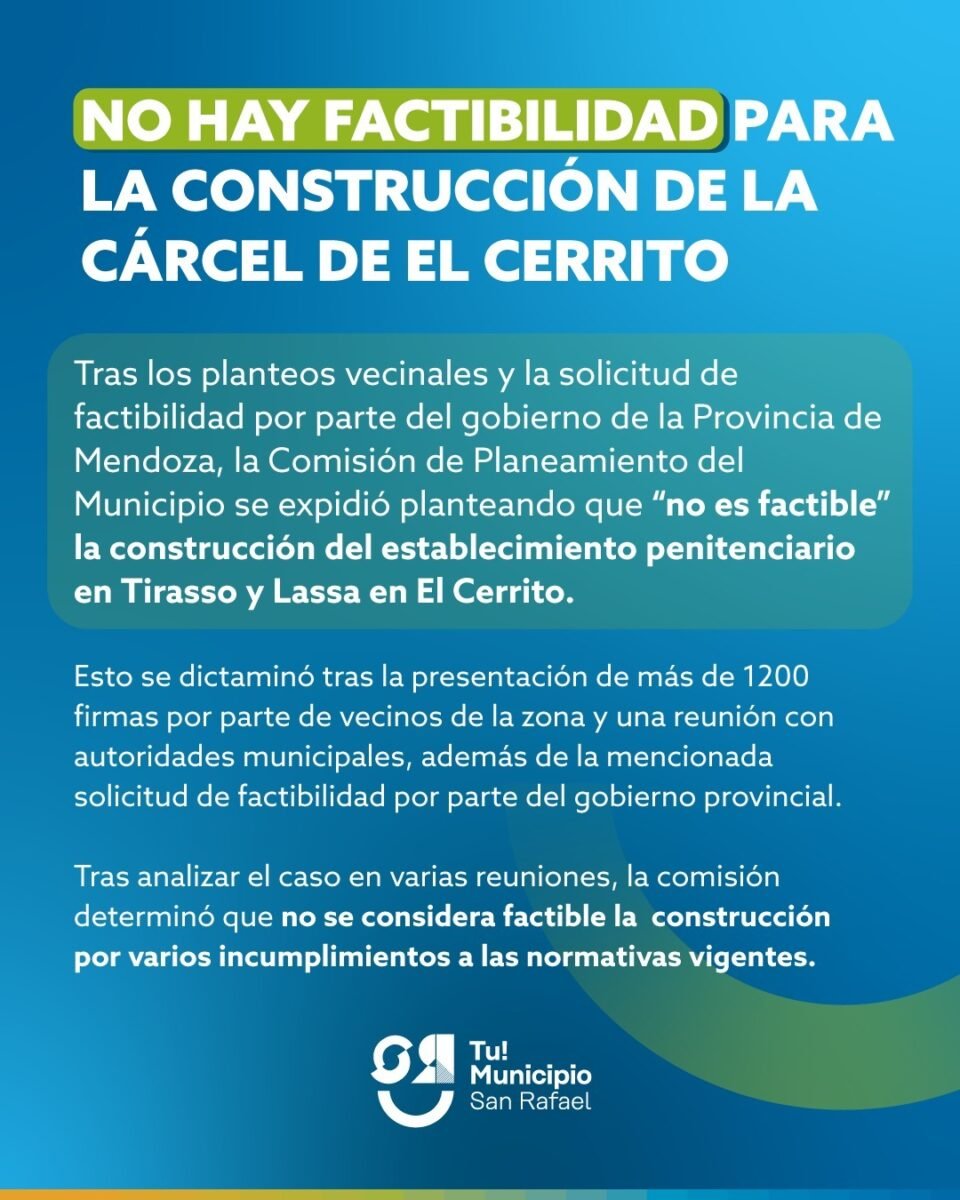 Tras los planteos vecinales y la solicitud de factibilidad por parte del gobierno de la Provincia de Mendoza, la Comisión de Planeamiento del Municipio se expidió planteando que “no es factible” la construcción del establecimiento penitenciario en Tirasso y Lassa en El Cerrito.