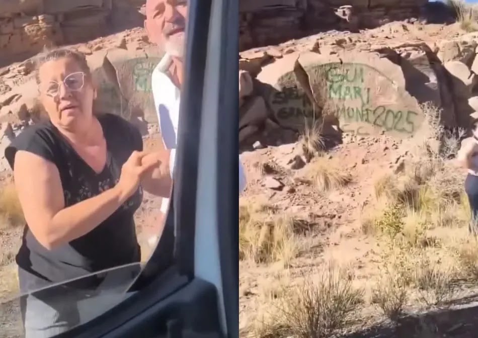 Todo ocurrió este fin de semana y el momento fue registrado por una persona que circulaba en auto por la Ruta Nacional 7. Al notar a una pareja escribiendo sus nombres con aerosol sobre las piedras, comenzó a grabarlos. Cabe destacar que este tipo de acciones están prohibidas por las leyes que protegen el medio ambiente en Mendoza.