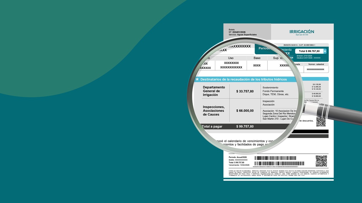 El Departamento General de Irrigación puso a disposición de sus usuarios un nuevo boleto de pago del canon en el que se puede apreciar qué porcentaje del total va para el organismo del agua y cuánto para la Inspección de Cauce, a la que pertenece el usuario, según su empadronamiento. Información que además aporta transparencia y conocimiento de los diferentes actores y sus funciones en la administración del agua.