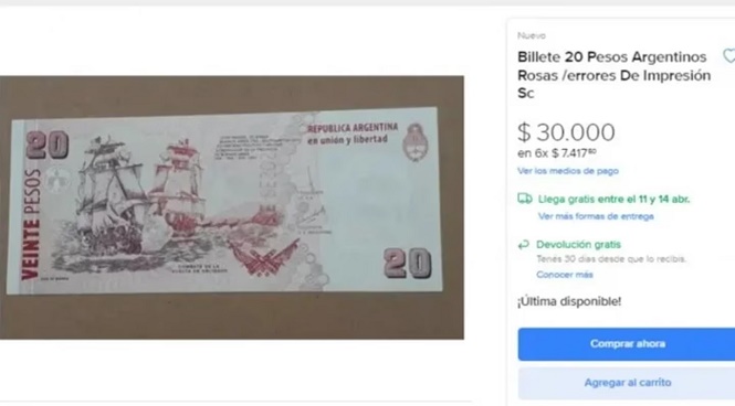 En ese sentido, ciertos billetes de 20 pesos han logrado alcanzar un gran valor de venta en las plataformas de comercio electrónico debido a ciertos errores en su impresión. Aquellos que tienen alguna particularidad en su diseño han adquirido un precio que puede ir hasta los $30.000 mil pesos.
