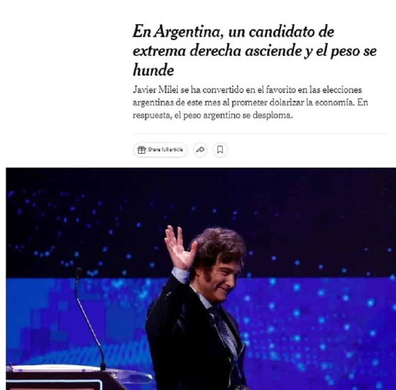 El texto “En Argentina, un candidato de extrema derecha asciende y el peso se hunde” escrito por Jack Nicas señala que el libertario “está provocando él solo un choque financiero en una de las mayores economías de América Latina”.
