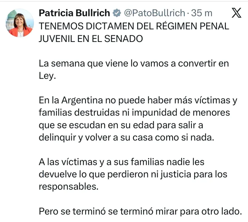 “La semana que viene lo vamos a convertir en ley. En la Argentina no puede haber más víctimas y familias destruidas ni impunidad de menores que se escudan en su edad para salir a delinquir y volver a su casa como si nada”, expresó desde sus redes sociales.