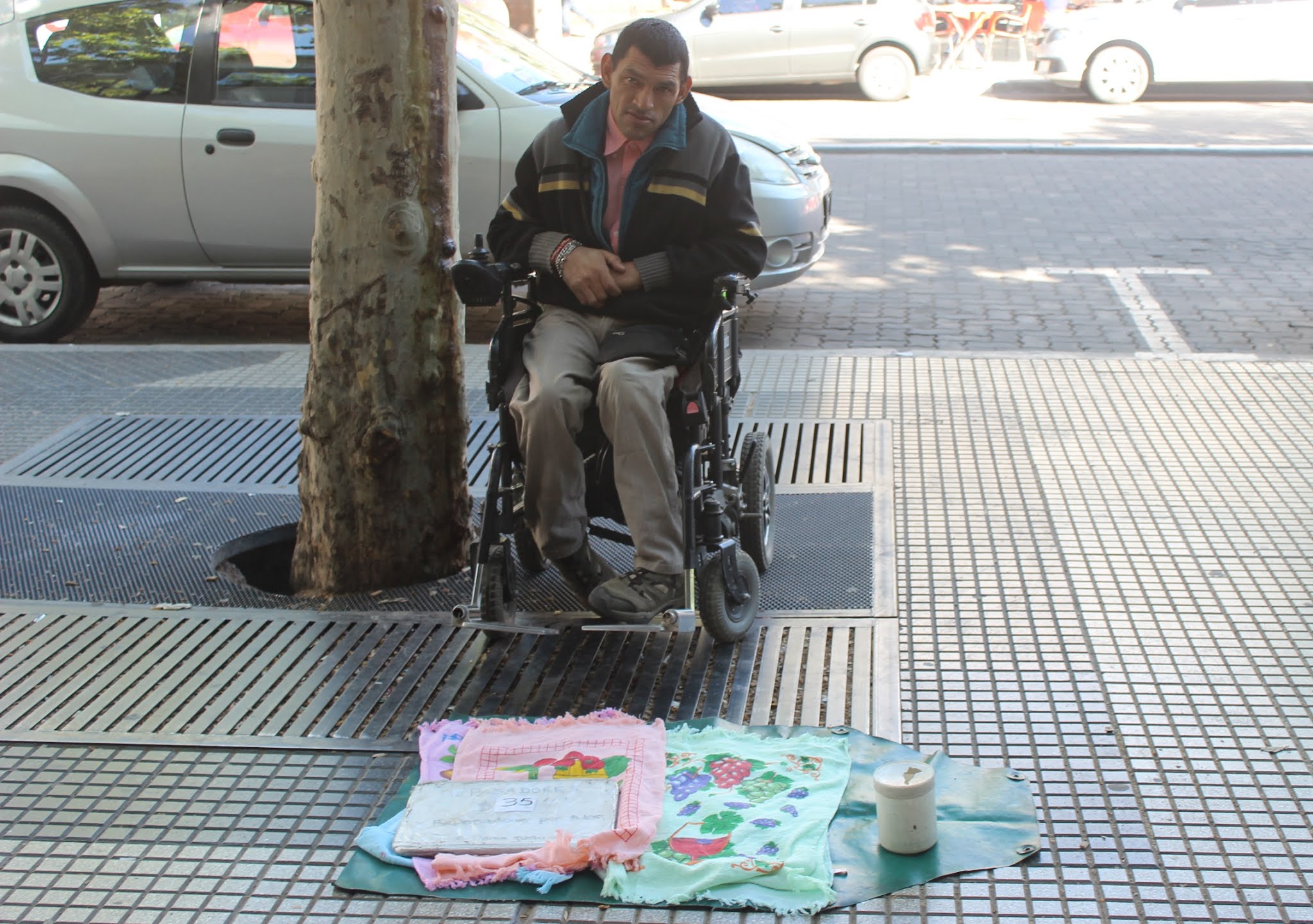 En la primera cuadra de avenida San Martín está Pepe, en su silla de ruedas, como todos los días, aguardando que los clientes se detengan a comprar los repasadores que tiene a la venta. Por estos días, uno a 35 pesos o tres por 100. Quien le compra sabe que no está haciendo un mero acto de caridad, sino que realmente, está comprándole a un vendedor que está trabajando.