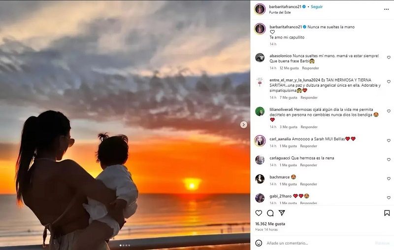 Días atrás, Barby Franco subió a su cuenta de Instagram una tierna imagen junto a su hija mientras miraban el atardecer desde la playa. Desde que se convirtió en madre, la modelo comparte varios momentos junto a la pequeña Sarah y esta no fue la excepción. Sin embargo, lo que más llamó la atención fue la reflexión que escribió en la descripción y que cautivó a todos sus seguidores.