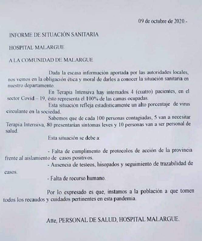 En una nota, fechada en el día de hoy, dirigida a la comunidad de Malargüe, personal de la Salud del Hospital Regional de Malargüe, dieron a conocer y alertaron sobre la crítica situación sanitaria por la que atraviesa el departamento del sur provincial.