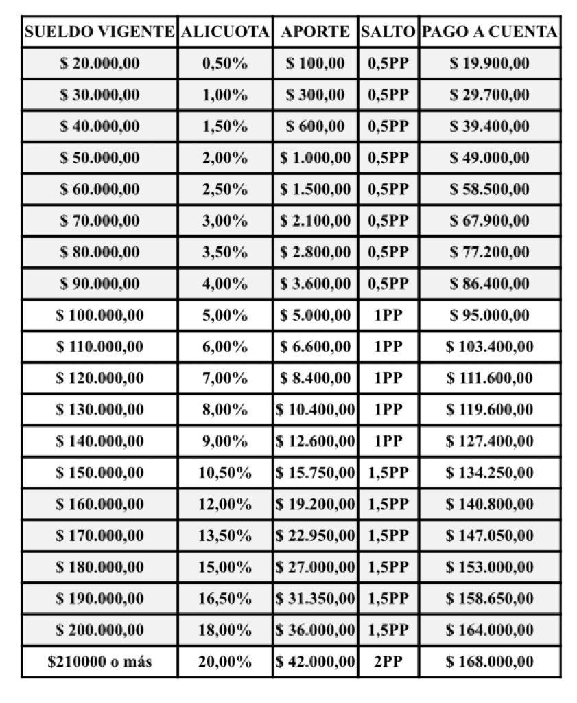 Los pagos a cuenta se aplicarán según alícuotas progresivos desde el 0,50% para el sueldo de $ 20.000 hasta el 20% para sueldos de $210.000 o más.
