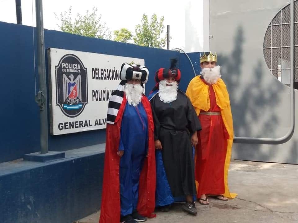 Personal policial de la Delegación de Policía Vial General Alvear con la colaboración de personal de Comisaría 14, Bomberos de ese departamento, Policía Judicial y Policía Rural, visitaron hoy, vestidos de Reyes Magos el Hogar de Menores “Vírgen Niña”, en Diagonal Pellegrini 2200.