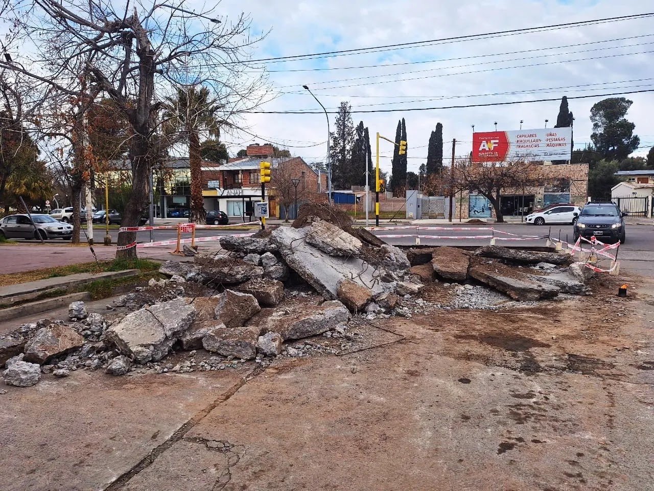 Hacemos hincapié especialmente en la esquina de Espejo e Yrigoyen donde se realizó la demolición de un importante paño de hormigón para su posterior renovación. Allí solo se encuentra habilitado media calzada.