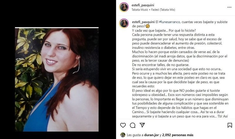 Pasquini remarcó que hay personas que deciden arrancar una dieta por la presión que impone la sociedad: “Muchos lo hacen porque están cansados de verse así, de la discriminación (el INADI arroja datos, que la discriminación por el peso, es la tercer causar de denuncias). De no encontrar talles, de no gustarse. Sí, sería estupendo vivir en una sociedad que esto no ocurra. Pero ocurre y a muchos les afecta, pero este posteo no se trata de eso”.