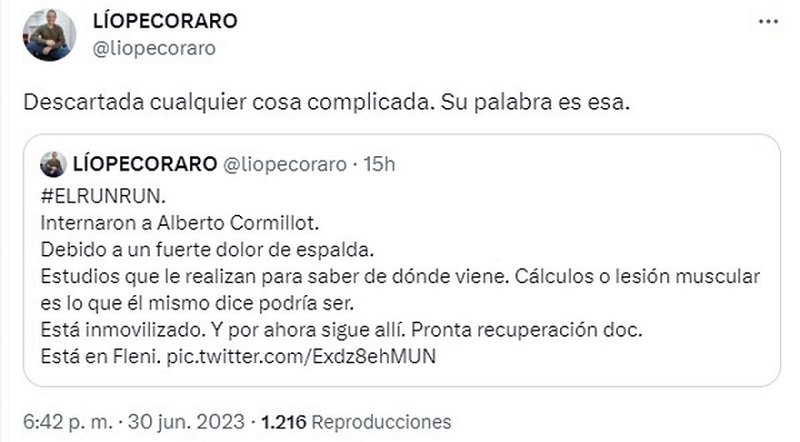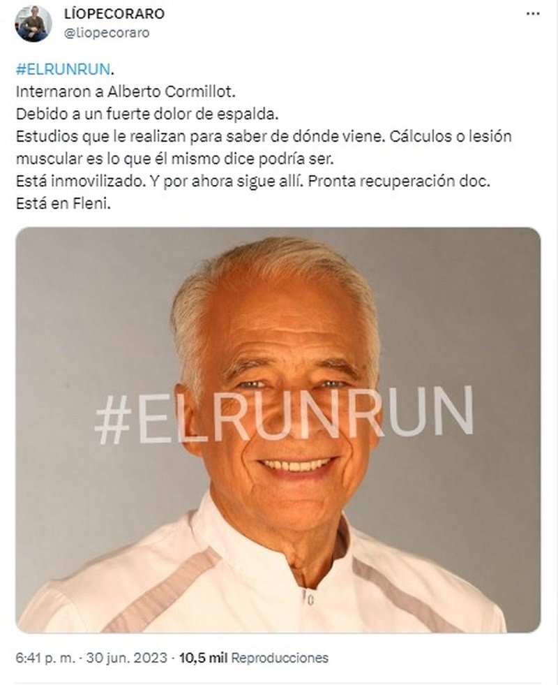 “Internaron a Alberto Cormillot debido a un fuerte dolor de espalda” escribió el periodista desde la red social del pajarito.