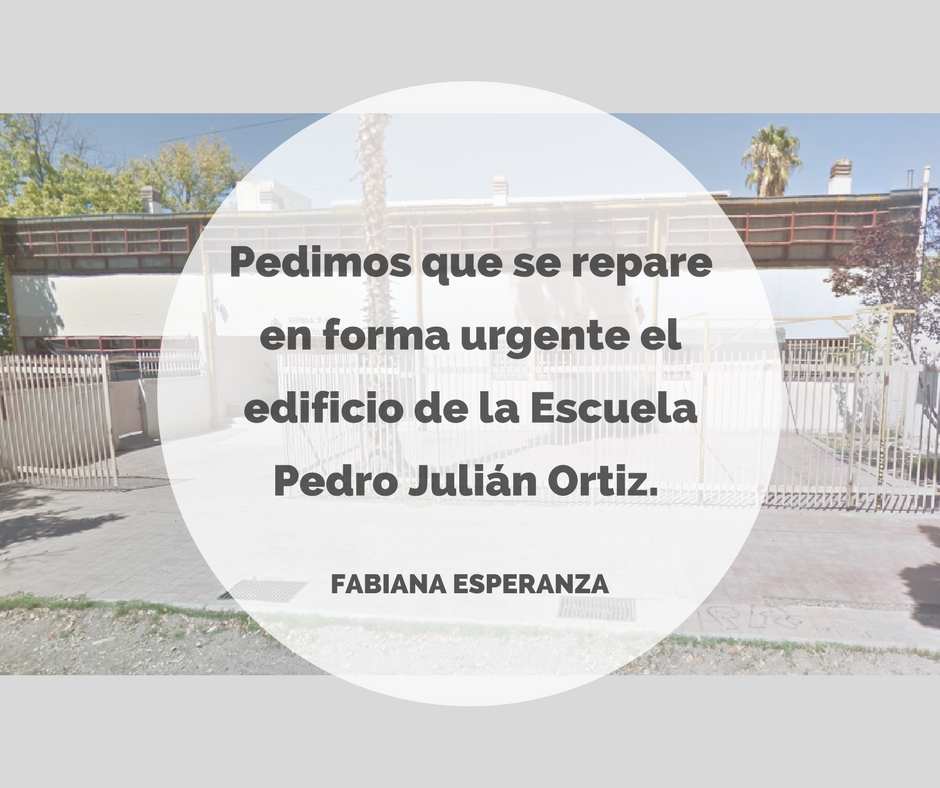 En este proyecto, la concejal solicita a la Dirección General de Escuelas (D.G.E), consideren la posibilidad de reparar la estructura edilicia y cañerías de la Escuela 1-324 “Pedro Julián Ortiz”, ubicada en calle Olascoaga 1380, del Departamento de San Rafael.