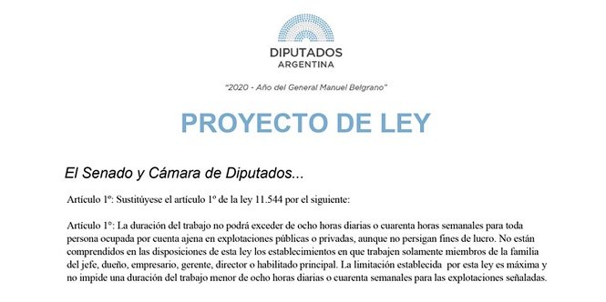 Por lo pronto se trata de un proyecto que determina que “la duración del trabajo no podrá exceder de ocho horas diarias o cuarenta horas semanales para toda persona ocupada por cuenta ajena en explotaciones públicas o privadas aunque no persigan fines de lucro”.