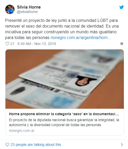 La iniciativa pertenece a la Federación Argentina de Lesbianas, Gays, Trans y Bisexuales (FALGTB)y es acompañada por Horne, legisladora del Frente para la Victoria (FpV). “(El proyecto propone) eliminar la categoría de ‘sexo’ de cualquier documento público o privado; y garantizar la integridad, la autonomía y la diversidad corporal de todas las personas frente a intervenciones destinadas a modificar sus características sexuales para adecuarlas a los estándares médicos de asignación sexual o ‘normalidad’”, señala el texto difundido por la entidad.