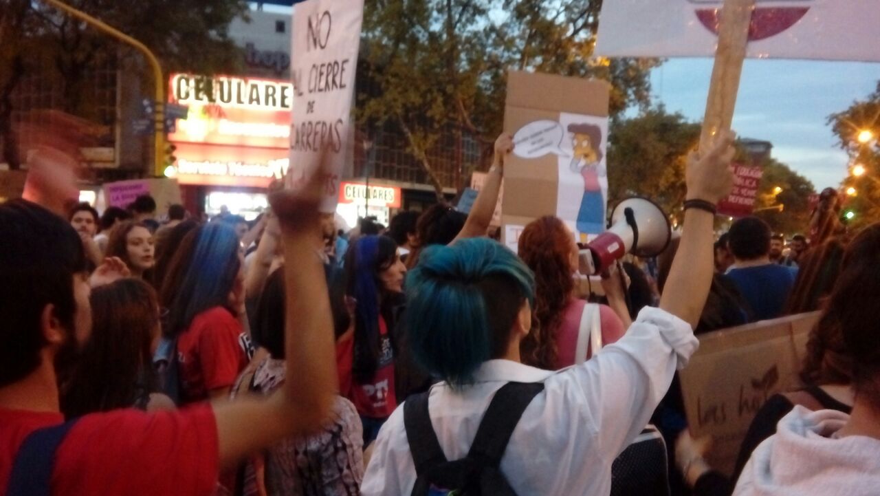 Este lunes en el centro sanrafaelino se desarrolló una manifestación de alumnos y docentes de distintas instituciones de nivel terciario frente al posible cierre de carreras, habida cuenta de que un decreto firmado por el gobernador Alfredo Cornejo deja sin efecto subsidios que recibían las instituciones educativas hasta ahora.