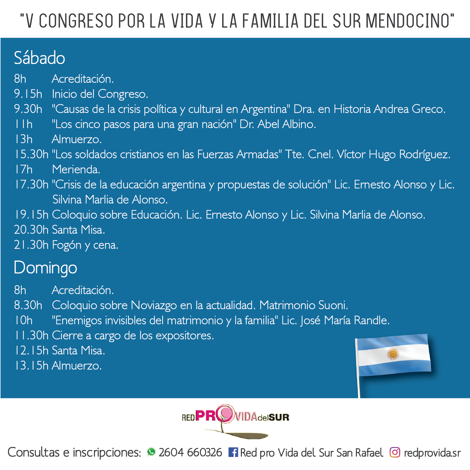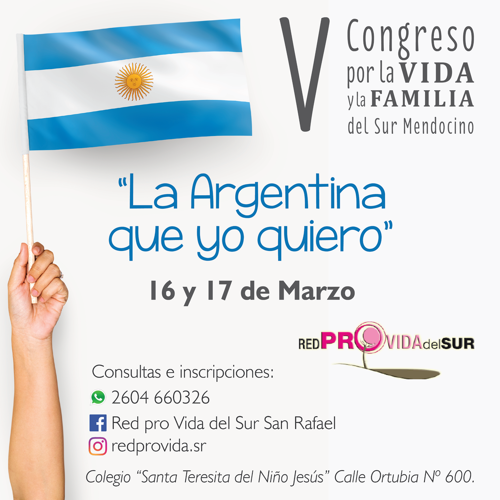 La Red Pro Vida del Sur, invita a la comunidad los días 16 y 17 de marzo, al Quinto Congreso por la Vida y la Familia del sur mendocino, el cual tendrá en el colegio ubicado en calle Ortubia al 600.