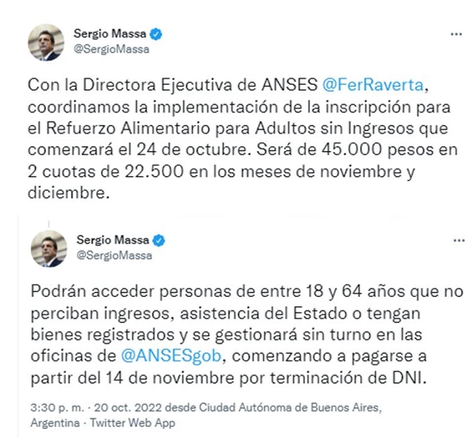 A partir del lunes 24 de octubre y sin turno previo en las oficinas de ANSES comenzará la inscripción del Refuerzo Alimentario de $45.000 pagadero en dos cuotas de $22.500 durante los meses de noviembre y diciembre.